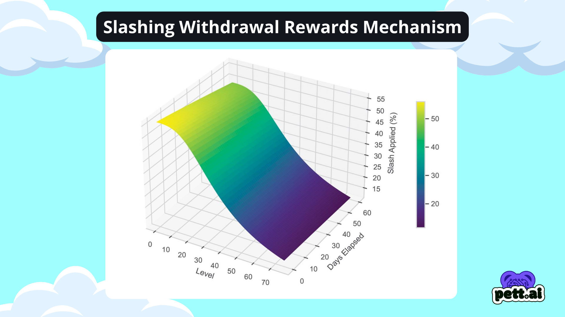 The Withdrawal Slash Function is designed to balance fairness & incentives taking two factors into consideration, elapsed time since initiating the withdrawal and the PettBro's level. The slash is only applied to tokens earned in-game. All $AIP tokens bought and deposited are exempt from any type of slash and can be withdrawn anytime.